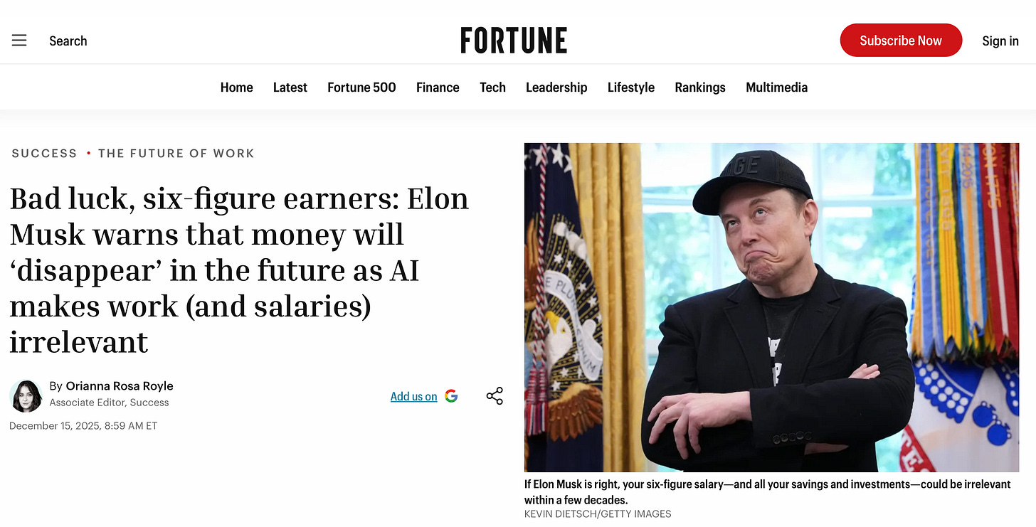 Dar dincolo de personaj și de aura lui publică, problema ridicată este reală și incomodă: dacă munca salariată dispare treptat, dacǎ banii dispar sau îşi pierd relevanța, ce se întâmplă cu mecanismul psihologic și social care ne-a ținut funcționali mii de ani?