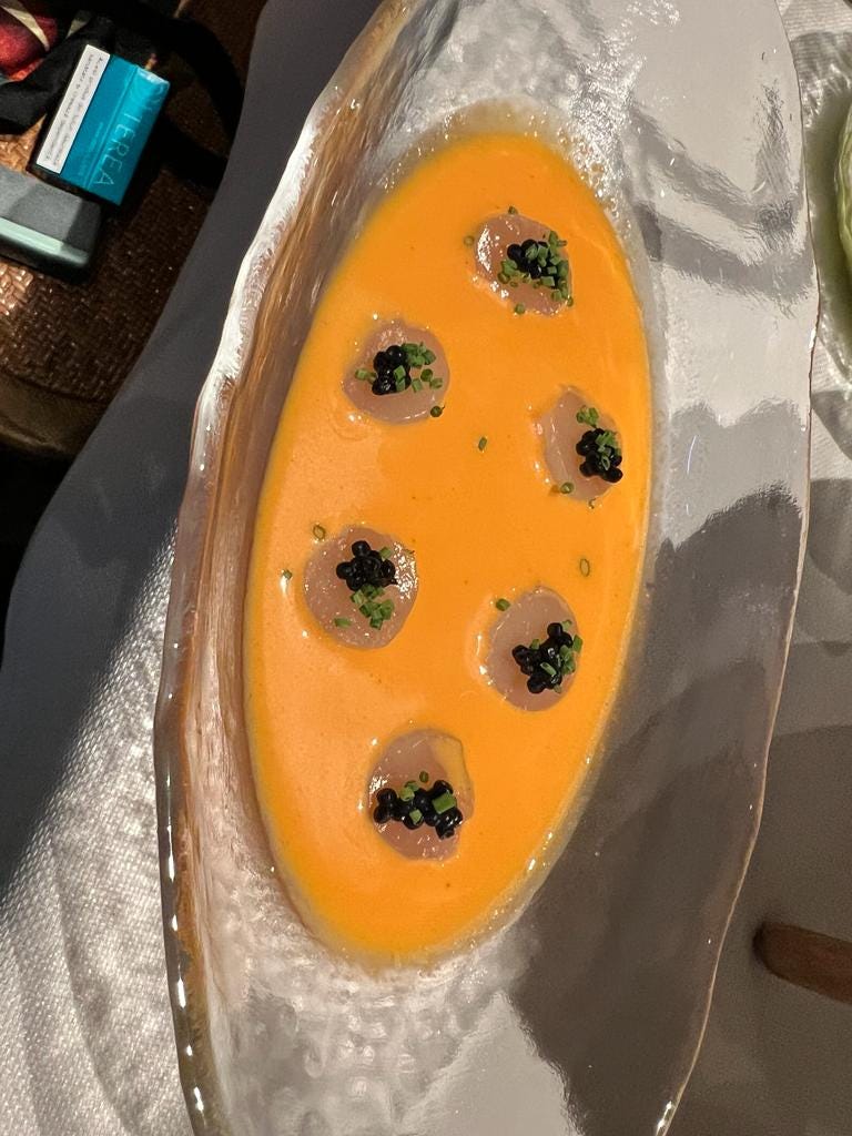 Mai jos un ceviche de scoici St Jacques cu un sos exceptional cu mirodenii marocane.