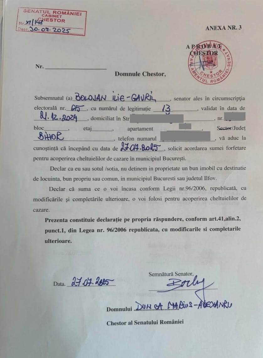 “O cerere care valorează cât suferința a 24 de tinere pe care Bolojan le-a condamnat la sărăcie prin măsurile de austeritate. Toate aceste femei plătesc asigurarea de sănătate în valoare egală cu suma forfetară pe care Bolojan o cere de la Senat pentru locuință.”