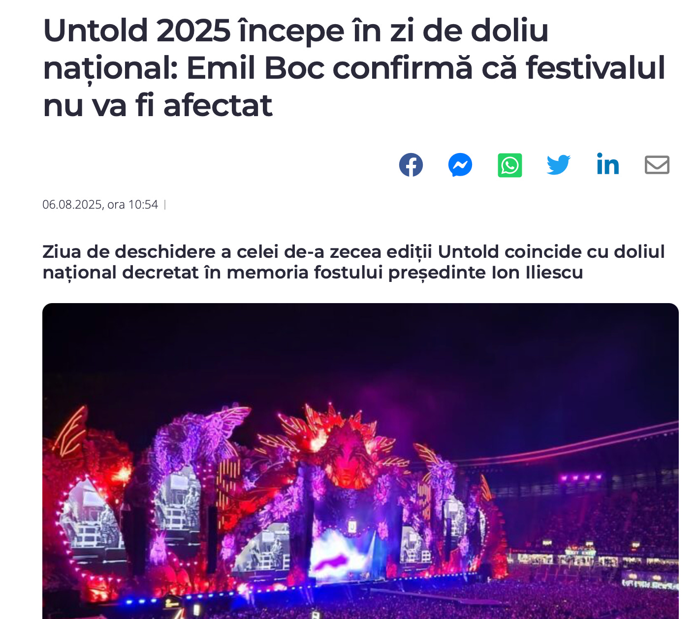 Nu e nimic anormal, cand vine vorba de Untold, festivalul cretinesc ce promoveaza LGBT si e patronat de pedofilul gay Bogdan Buta, copil de fost ofiter SRI si protejatul gulerelor albe: anormal ar fi fost chiar sa se respecte Legea si prevederile unei zile de doliu national. Dar vaca de muls Untold din care se scurg zeci de milioane de euro nu se stie unde nu poate sa fie tinuta in grajd. La Cluj, se incalca toate legile posibile de circa 10 ani pentru ca acest festival sa se desfasoare “in bune conditii”: zeci de mii de metri patrati din Parcul Central si strazi adiacente sunt blocate doua saptamani pe bani de nimic pentru Untold, spitalele nu mai primesc bolnavi ca… deh, Untold, orele de liniste sunt calcate in picioare de digeiala cretina si artificii care se termina de fiecare data la 6 dimineata.
