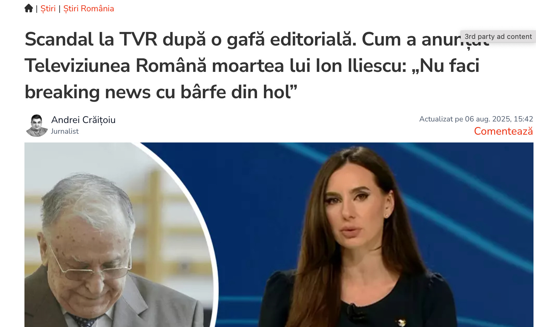 Un incident fără precedent a avut loc sâmbăta trecuta la Televiziunea Română, când în direct, la jurnalul de la ora 14.00, a fost anunțată, din greșeală, moartea fostului președinte Ion Iliescu. Informația, preluată neverificată dintr-o postare de pe Facebook, a ajuns pe post printr-un lanț de erori editoriale și presiuni din regie.
