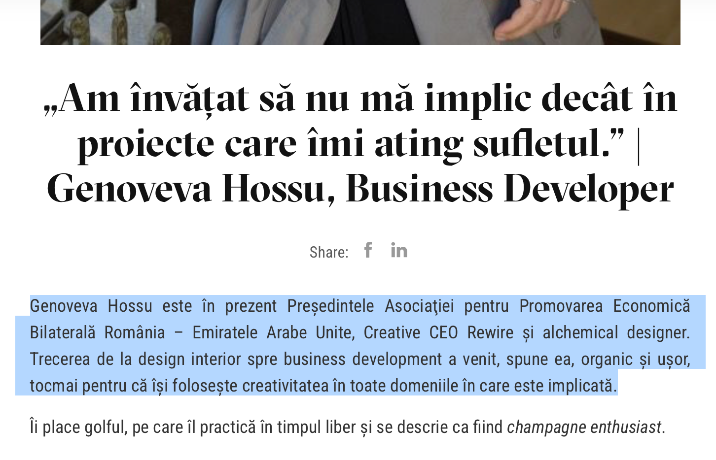 N-o sa fiu lipsit de obiectivitate si trebuie sa va spun ca, intr-o vreme, deja apusa, Genoveva isi crease un context relational superb in Dubai, o lume unde e greu pentru un barbat non-arab sa beneficieze de increderea arabilor, daramite unei femei.