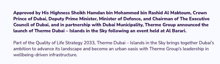 "The Dubai 2040 Urban Plan and Therme Group’s mission are deeply aligned. We both believe cities must evolve to enhance human wellbeing, connection, and environmental harmony. This collaboration is more than a development—it’s a new way of thinking about cities and their role in shaping a healthier future for all."