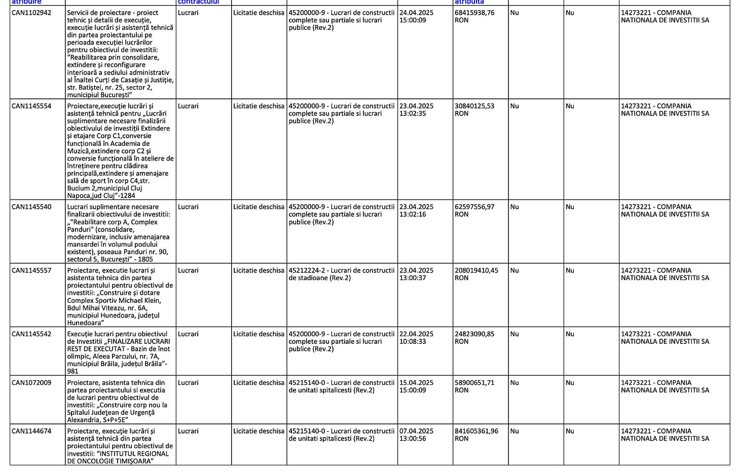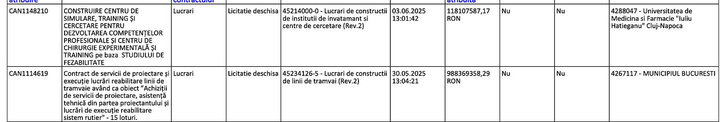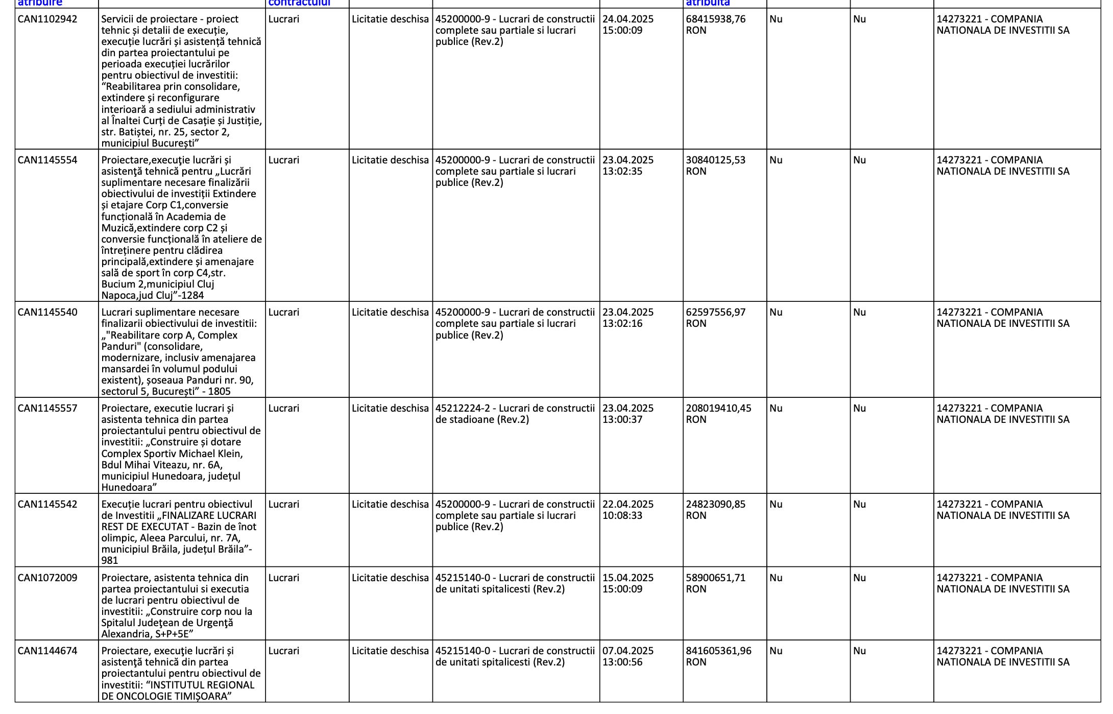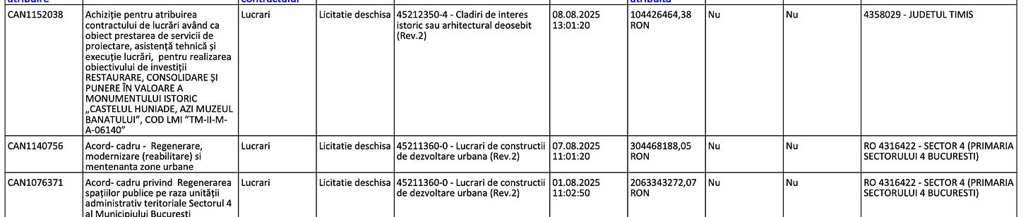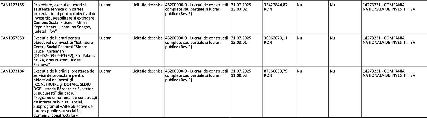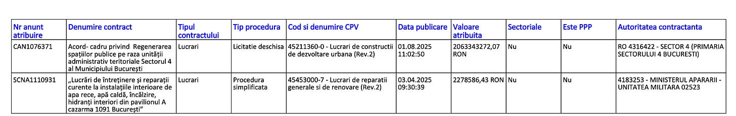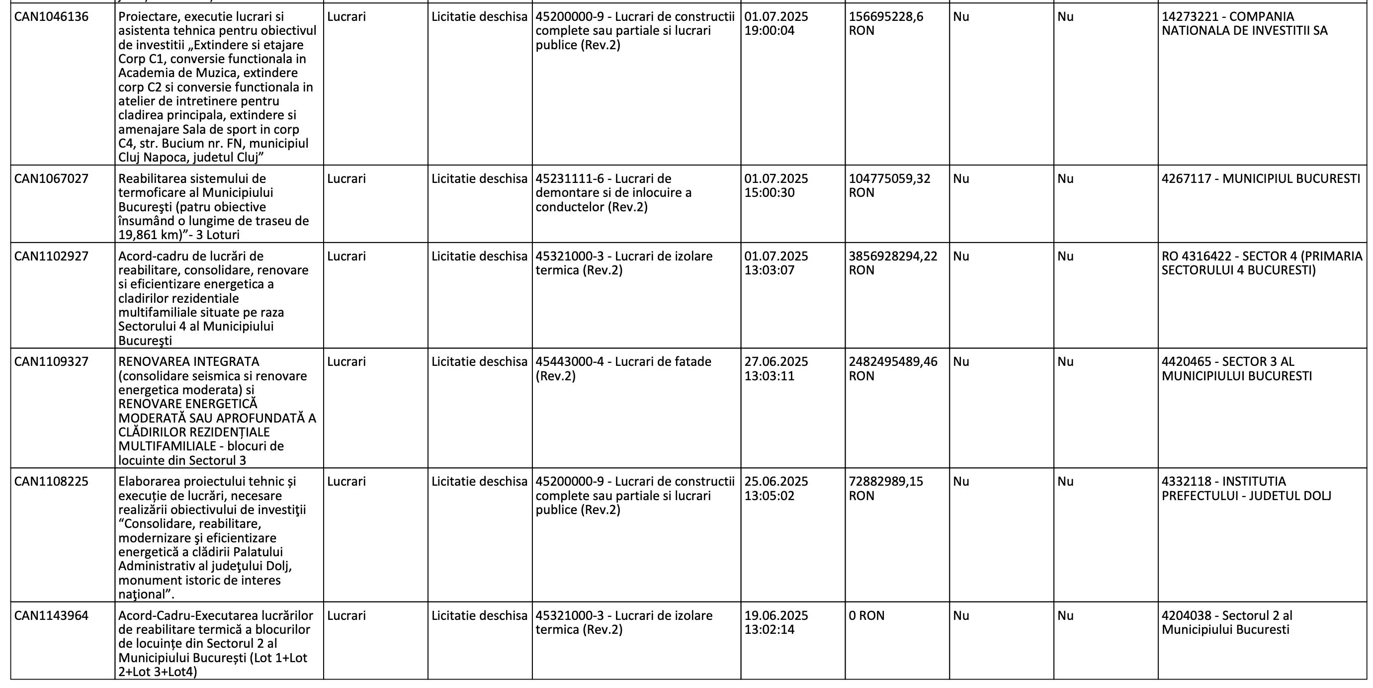 20.115.186.406,73 lei + TVA reprezintă suma contractelor atribuite în 2025 până la data la care scriu aceste cifre (29.VIII.2025), din care 3.310.068.374,89 lei + TVA sunt cu CNI. (la care se mai adaugă un acord-cadru căruia n-am avut timp să-i studiez detaliile - Acord-Cadru-Executarea lucrărilor de reabilitare termică a blocurilor de locuințe din Sectorul 2 al Municipiului București (Lot 1+Lot 2+Lot 3+Lot4))