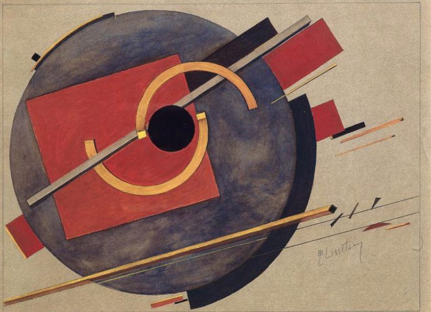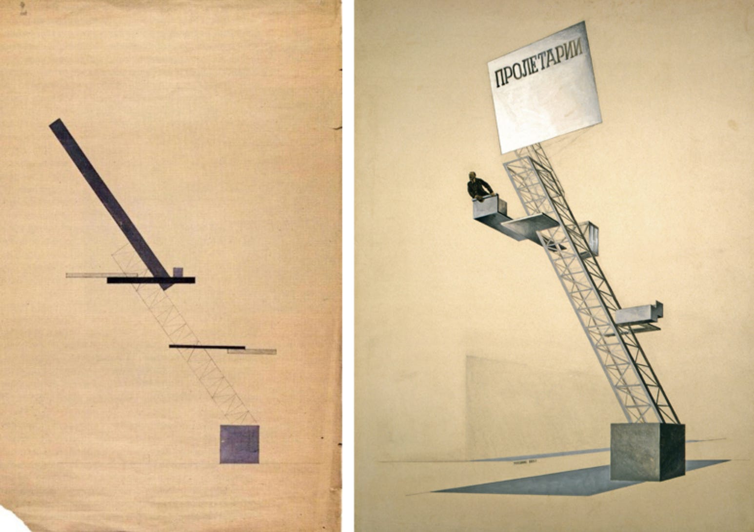El Lissitzky a fost un artist de avangardă rus și o figură majoră atât în Suprematism, cât și în Constructivism. Posterele sale politice, fotografiile și picturile îmbină abstracția formală cu tipografia, așa cum se vede în seria sa Proun. „Artistul construiește un nou simbol cu pensula sa. Acest simbol nu este o formă recognoscibilă a ceva ce este deja încheiat, deja făcut, deja existent în lume”, spunea el. „Este simbolul unei lumi noi, care se clădește și care există prin intermediul oamenilor.”