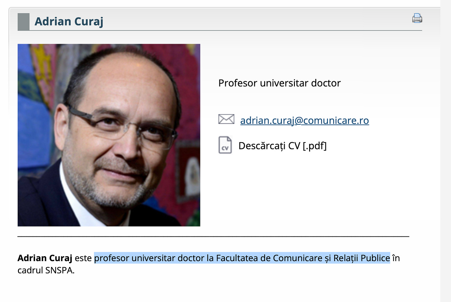 Domnul Adrian Curaj e curajos doar cu numele. In rest, e securiciul perfect integrat in sistem: profesor de comunicare la SNSPA, manca-ti-as, el, inginer telecomunicatii. Tot cu comunicatii ceva.