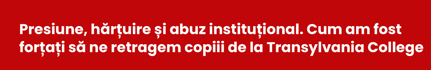 Prin acest text îmi propun să ofer transparență cu privire la experiența extrem de stresantă prin care Transylvania College ne-a târât în ultimele 3 luni, și să vorbesc despre anumite aspecte pe care până acum nu le-am putut face publice. Sper ca acest text să ajute alți părinți.