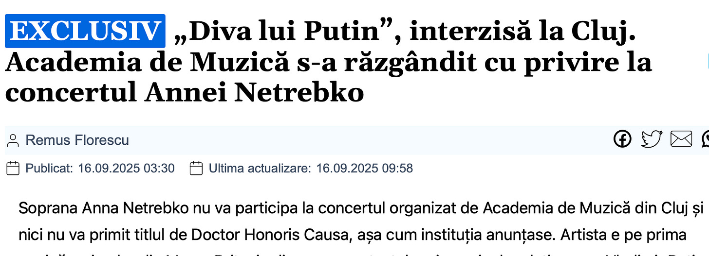 Mai stiti povestea de acum doua saptamani cu “notabilitatile” clujene pline de basini sfertodocte in cap care au luat decizia sa o alunge pe ditamai diva lumii operei Anna Netrebko care ar fi trebuit sa inaugureze noul sediu al Academiei Naționale de Muzică din Cluj-Napoca?