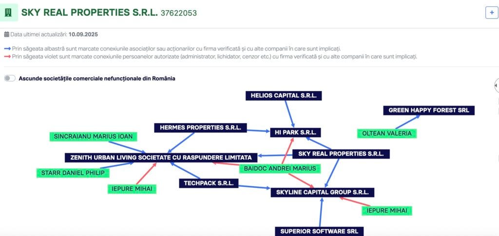 Primele trei firme Sky, Hermes și Helios sunt toate conectate între ele (vezi mai jos schema de pe termene.ro), prin intermediul unor asocieri de acționari interpuși și prin alte firme (unele offshore), care ascund numele altor liberali clujeni. În cele trei firme care-și asumă în mod deschis proiectul de pe Turzii, pe post de „asociați” și „administratori” figurează în prezent socrii lui Ovidiu Vișan – părinții Alidei Vișan, respectiv Oltean Valeria și Oltean Nicolae Vasile, având sediul social în Florești – dar și Andrei Marius Baidoc, un partener mai vechi de afaceri al lui Călin Forna.