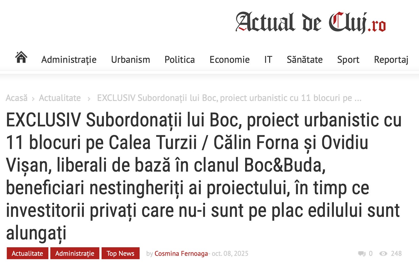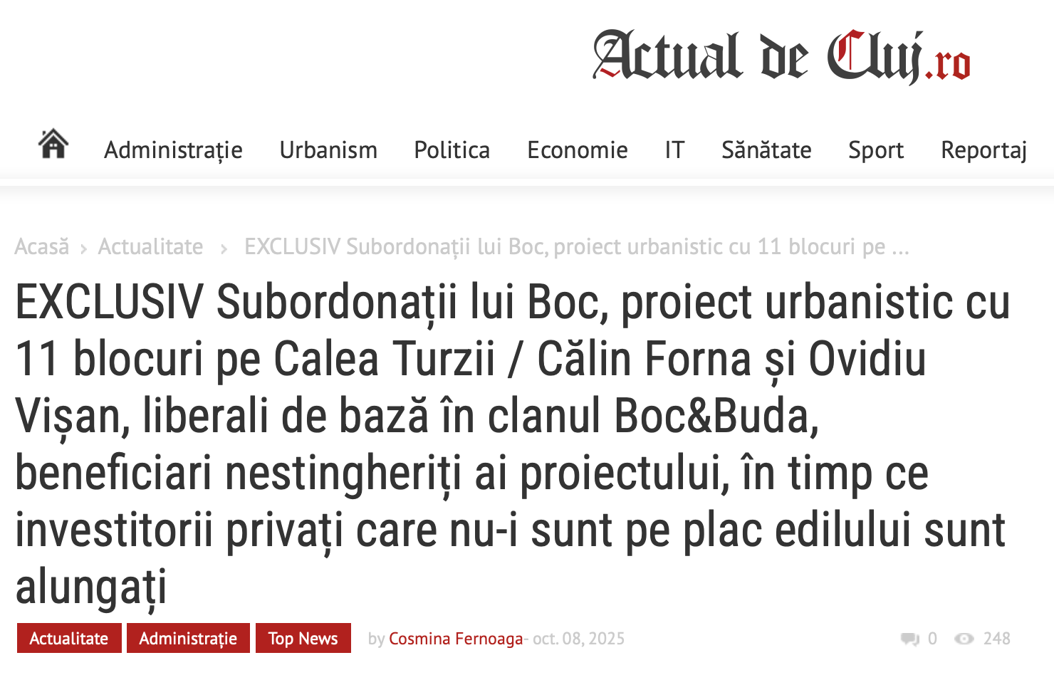 La ședința Consilului Local de joi urmează să fie aprobat un PUZ de urbanizare a unui teren de 1,13 ha, pe Calea Turzii (nr.235-237), care implică construirea a nu mai puțin de 11 imobile. Principalii artizani ai proiectului sunt consilierul local PNL Ovidiu Vișan și directorul adjunct al Direcției de Dezvoltare din Primăria Cluj, Călin Forna (și el membru marcant al PNL), ambii cu afaceri puternic dezvoltate în ultimii ani de sub umbrela primăriei și a altor instituții controlate de PNL, asta în timp ce edilul Emil Boc își promovează o imagine de zbir în materie de construcții, alungându-i pe investitorii care nu-i sunt lui pe plac.