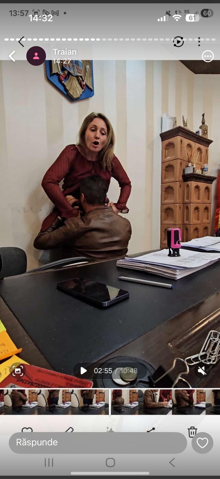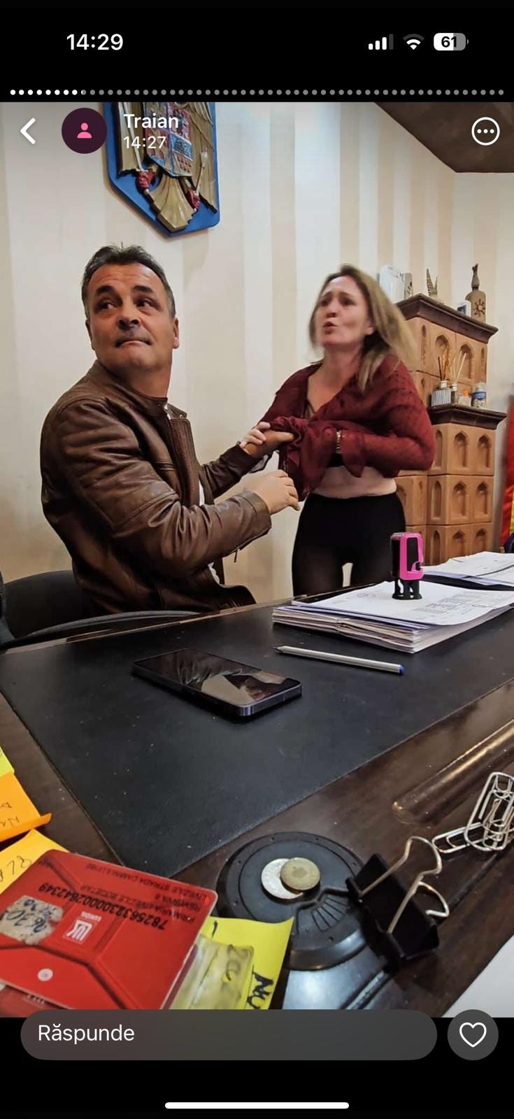 Deși din fotografii pare că doamna e agresată sexual — și poate că a și fost fix în acel moment, în sensul că primarul dornic voia să o aibă pe loc, în biroul său —, trebuie să știți că zbaterile ei sunt doar pentru că se temea, doamna, să nu fie prinși de cineva. În fapt, relația de amantlâc durează de circa cinci ani.