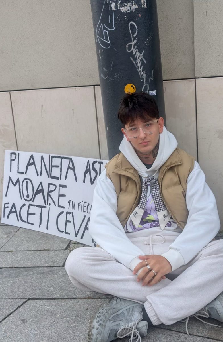 Un tânăr de aproximativ douăzeci și unu de ani stătea la colțul străzii cu o pancartă despre protecția planetei și echitatea socială.