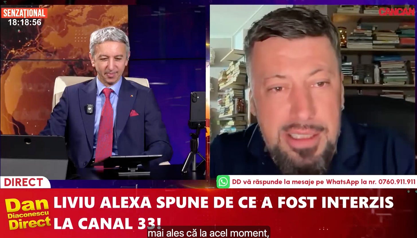 Eu recunosc că știu despre ea de la depărtare, nu știu intimități financiare între trustul Cancan și ei pentru difuzarea acestei emisiuni și tu și emisiunea ta să fiți difuzați și la ei, așa cum este un mijloc de transmisie și YouTube, și TikTok, și altele. Trebuie să înțeleagă telespectatorii și — cum să le zicem la ăștia de pe TikTok — prietenii noștri, social-spectatorii, social media-spectatorii, că Dan Diaconescu n-a făcut nimic altceva pentru Canal 33 decât să difuzeze sau să producă o emisiune pe care oricum o producea și înainte, în stilul lui, cu anvergura lui, cu invitații lui, atent și interesant aleși. Dar în acest răstimp, de câte luni, Dane, cât ai avut?