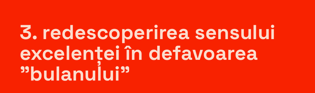 Această cultură a mediocrității cǎlduțe, în care nimeni nu trebuie să exceleze prea mult pentru a nu evidenția eșecul celorlalți (mai țineți minte dezbaterea „hai să nu mai dăm coronițe premianților la final de an, să nu-i jignim pe cei care nu pot fi mai buni la învățătură”?), este toxică pentru orice proiect de dezvoltare colectivă.