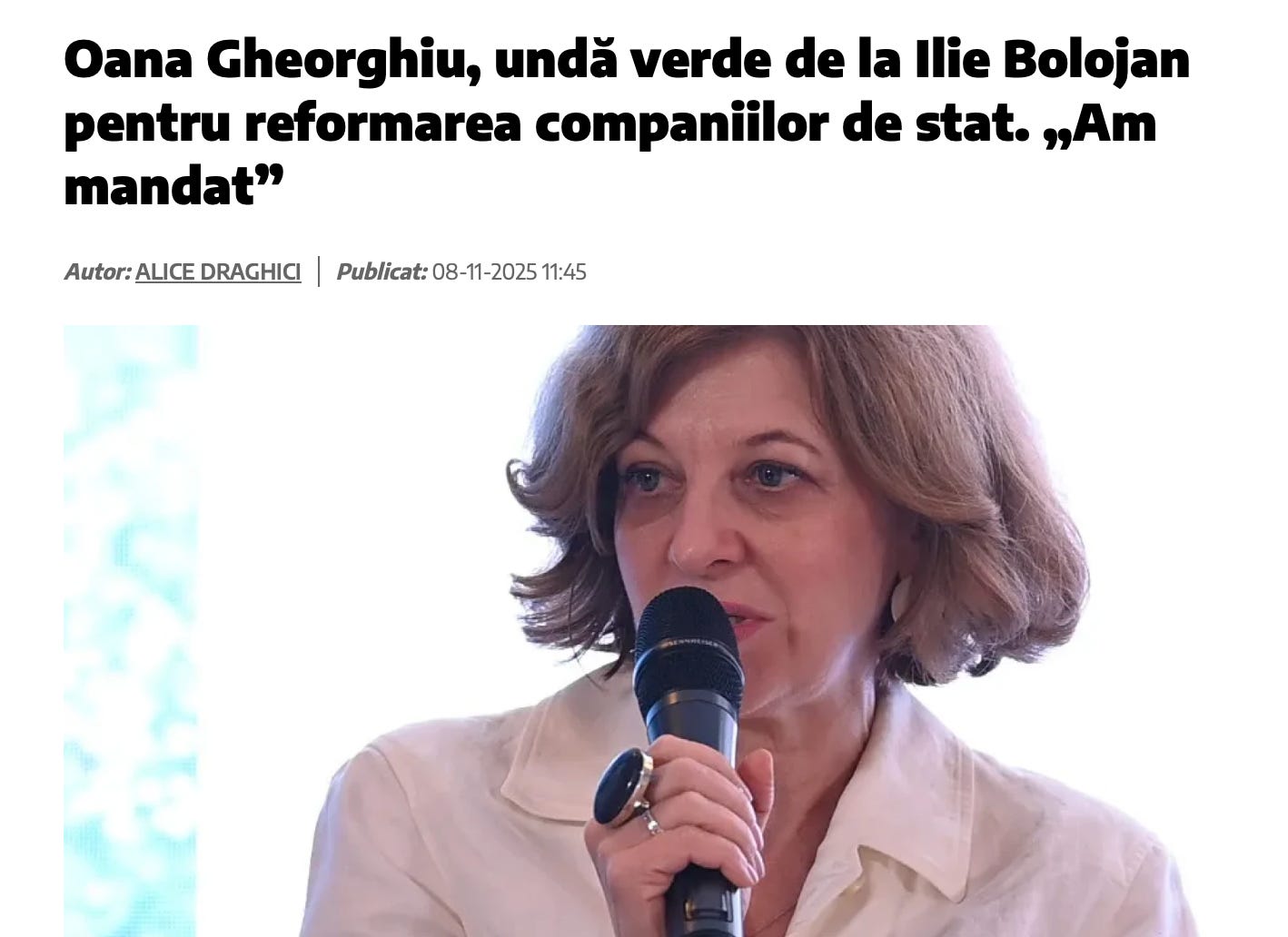Vicepremierul Oana Gheorghiu a declarat că premierul Ilie Bolojan i-a oferit libertate totală în demararea reformei companiilor de stat. Potrivit acesteia, nu i s-au impus restricții și i s-a cerut explicit să înceapă procesul de transformare instituțională.