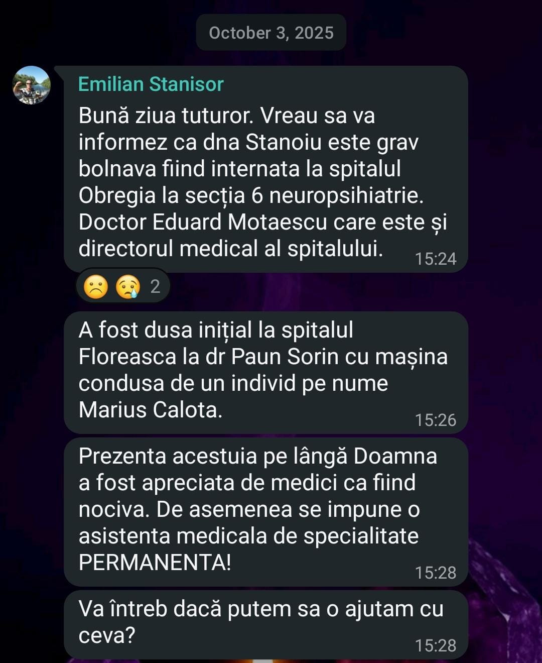 Tot ce spune în mesajul de pe Facebook Emilian Stănisor se confirmă, nu am voie să pun documentul din care citez, dar Parchetul poate verifica oricând că doamna Rodica Stănoiu a fost adusă de la Floreasca la Obregia în 3 octombrie 2025 și a fost externată cu scandal pe 7.10 (voi reveni despre episod).