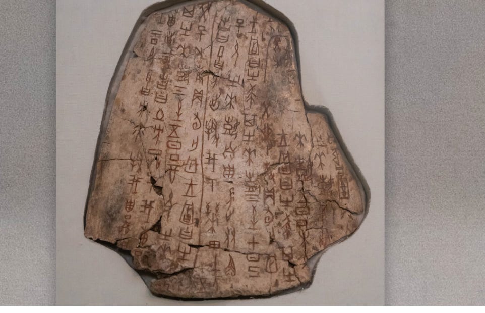 (mai jos în fotografie - “oasele oracol” (în chineză: jiǎgǔwén, 甲骨文) fragmente de os de animal (în principal omoplați de bou) sau carapace de broască țestoasă folosite pentru divinație (prezicerea viitorului) în China antică, în special în timpul dinastiei Shang (c. 1600–1046 î.Hr.). Acestea sunt cele mai vechi inscripții cunoscute ale scrierii chineze.