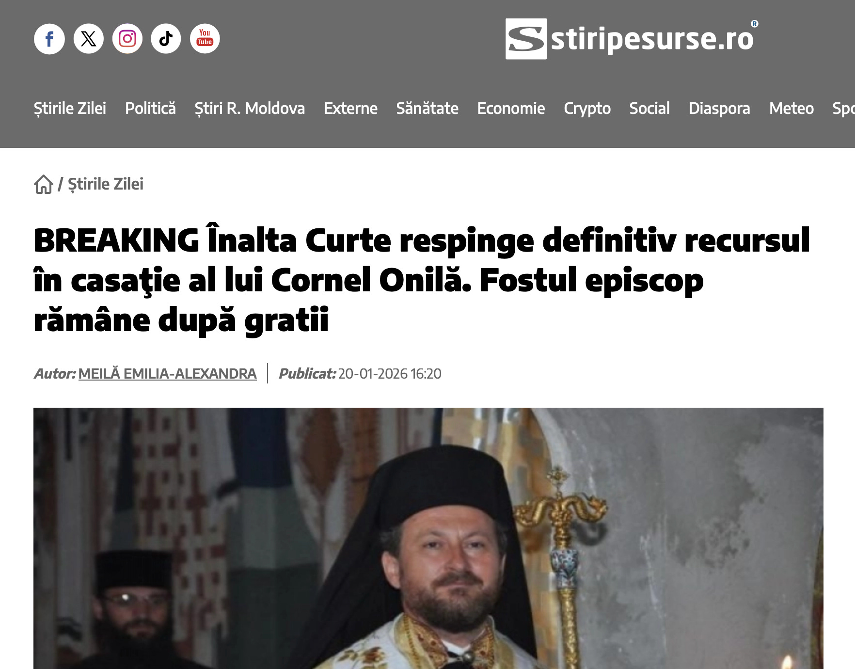 A venit ştirea asta în aceastǎ searǎ: s-a respins recursul fostului episcop de Huşi Cornel Onilă, condamnat la opt ani de închisoare pentru viol, agresiune sexuală şi şantaj.