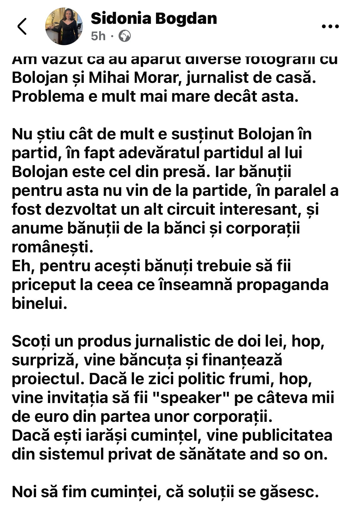 Textul ei zice totul și nimic, bănuiește fără să demonstreze, insinuează fără să numească. Bine, Mihai Morar nu a făcut presă în viața lui, nu știu de ce e considerat papagalul ăla jurnalist, dar asta e altceva.