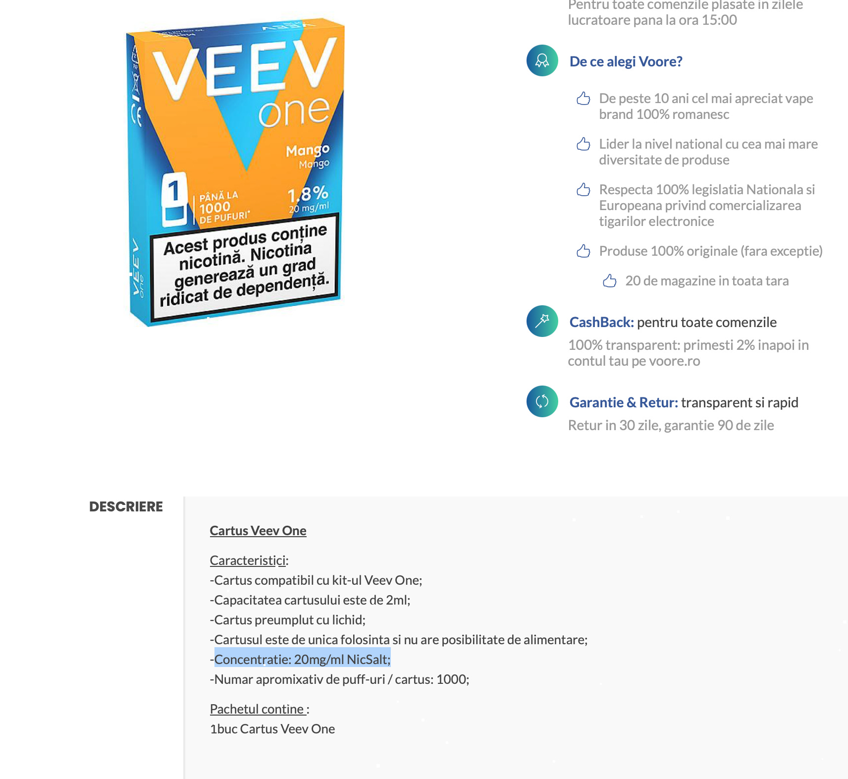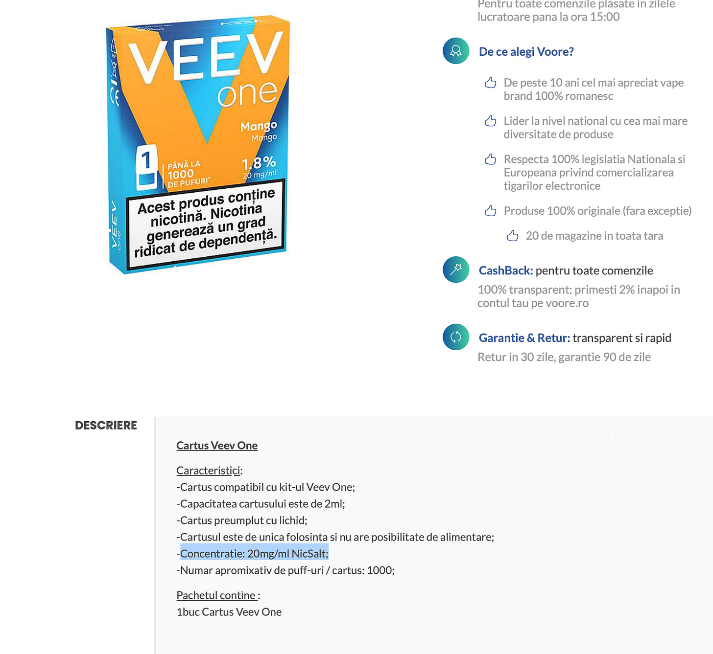 VEEV ONE : 20 mg nicotină/ml. O capsulă are 2 ml, egal 40 mg nicotină.