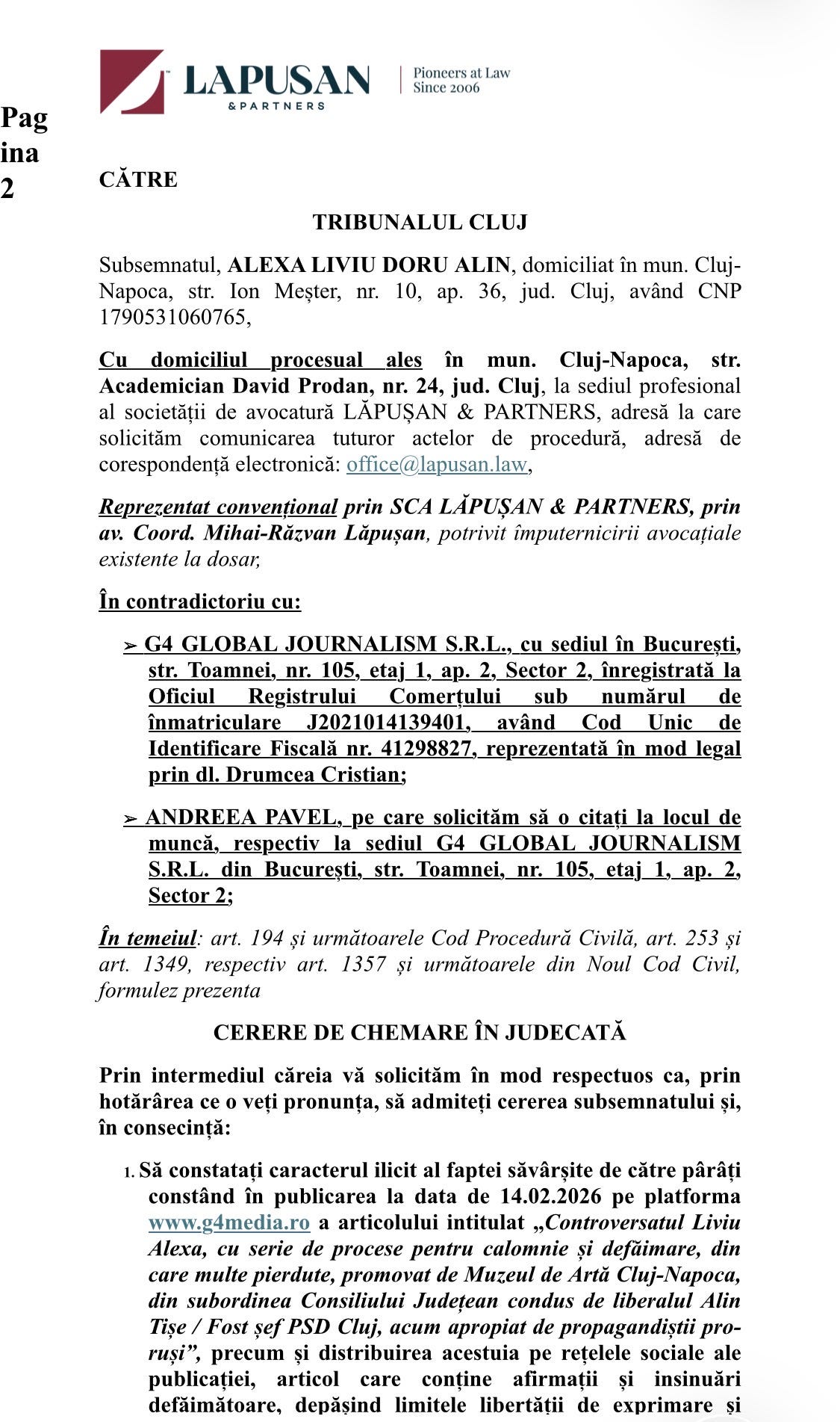 Așa că luni după masă am depus cerere de ordonanță președințială pentru a elimina articolul care dăunează expoziției mele și am făcut și cerere pe fond de chemare în judecată a lui Răducu.
