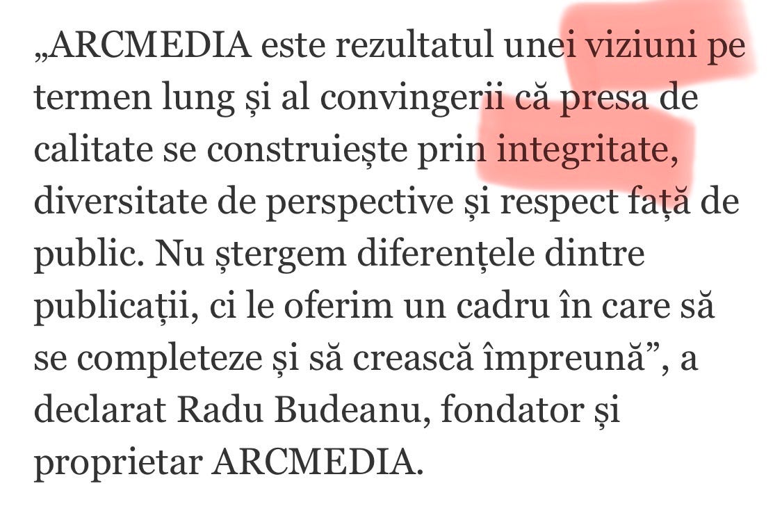 Ok, că a fost el tovarăș de Moet la Monaco cu toți ciorditorii, că s-a făcut livrator Glovo de șpăgi între Buzăianu și Udrea, plm, aia a fost, toți avem păcate mari și mici, dar pentru moment, important pentru mine “erea” că Budeanu îmi spusese în trecutul recent cât mă respectă ca jurnalist și că semnase un comunicat pompos în decembrie 2025 anunțând o labă tristă de entitate, ArcMedia, brand umbrelă al mărcilor sale de presă, unde enunțase chestii tari precum “viziune”, “deontologie”, alea alea.