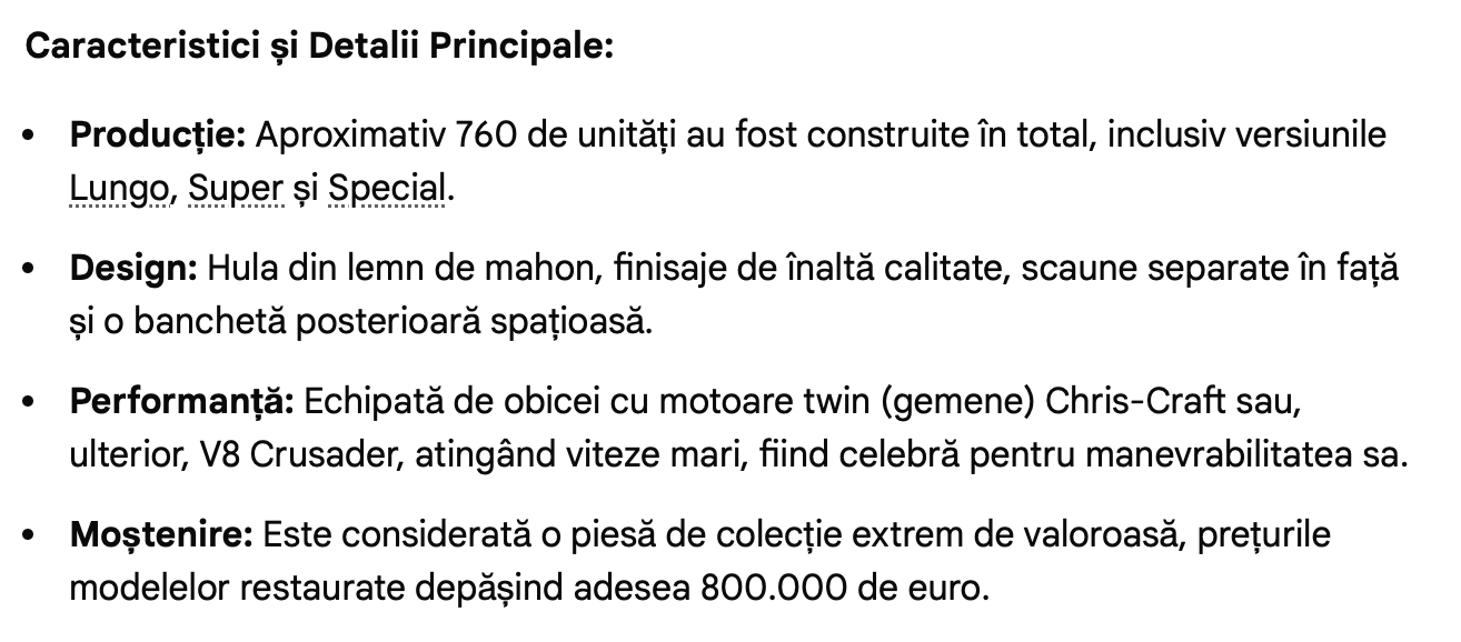Acest model de barca, de doar 8,2 metri, complet de lemn, a fost si inca este considerata, cea mai frumoasa barca produsa vreodata in lume. Valoarea unei asemenea barci, total restaurate astazi, depaseste 1,2 mil Euro.