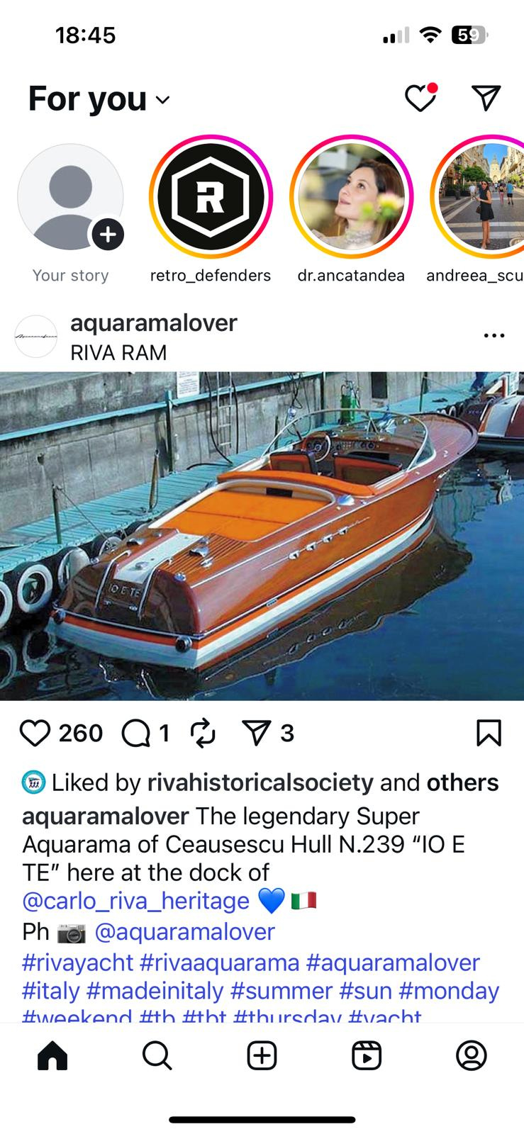 La finalul anilor ‘60, presedintele de atunci al Romaniei, Nicolae Ceausescu cumpara prin gospodaria de partid doua barci cu motor RIVA AQUARAMA.