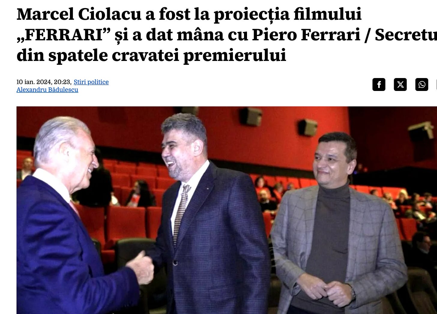 Mai intai, i-a intrat in gratii lui Ciolacu, premier pe atunci, aducandu-i un boost electoral de imagine. Era in ianuarie 2024, cand, la lansarea filmului “Ferrari”, a Marcel Ciolacu, in calitatea lui de candidat socialist la Presedintie, s-a intalnit in sala “cu totul intamplator” cu Piero Ferrari si au marcat momentul cu cateva poze.