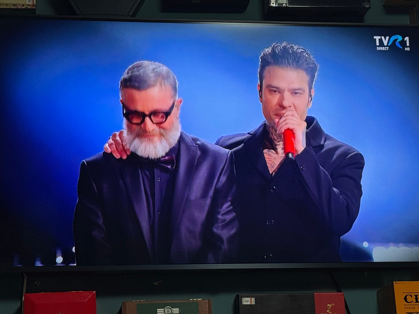 Doamne, ce de căcat a ajuns Sanremo! Numa’ femei machiate frumos și în rochii superbe, numa’ cântece mișto, numa’ băieți cu voce, îmbrăcați finnn, zero băieți cu tocuri în tutu ca la iorovizion, zero fete vopsite la păr în albastru, zero cântece angajate social despre puțica de balenă ce trebuie salvată, băăăăăăă, mai evoluați, băăăăăă! Evident, zic la mişto.