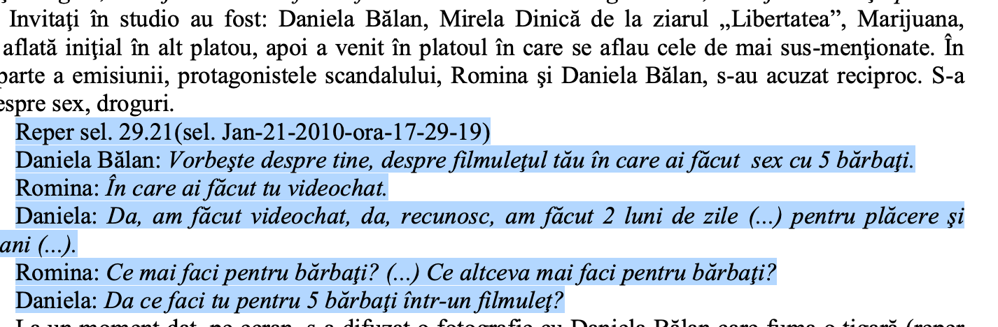 Azi, vă pun pe tavă niște stenograme din cadrul unei ședințe CNA din 2010, un episod uitat despre marea nevastă a lui Ferrari, în care o colegă prostituată o acuză că s-a lăsat filmată cordindu-se cu 5 băieți, iar Romina, tipic pentru profilul psihologic pe care îl public mai jos, nu numai că nu contestă filmulețul porno, dar atacă acuzând-o pe interlocutoare de o altă porcărie.