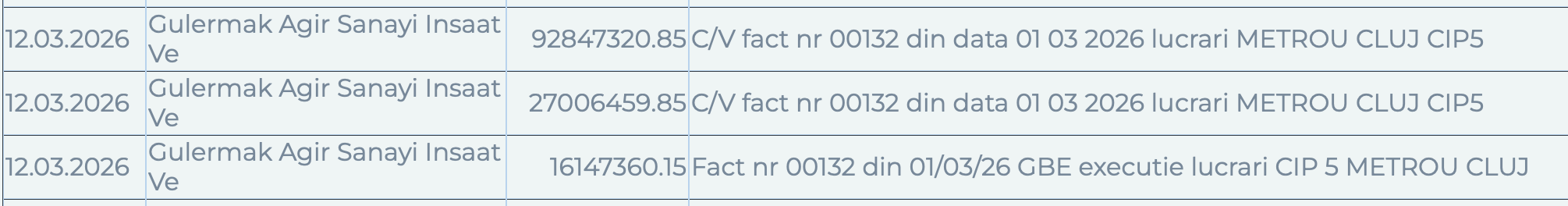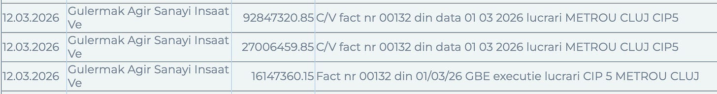 Pe ascuns, ca să nu fie probleme cu presa și societatea civilă, primarul Emil Boc a mai făcut acum opt zile trei plăți imense către Gulermak, constructorul turc al metroului clujean: 27 de milioane de euro!
