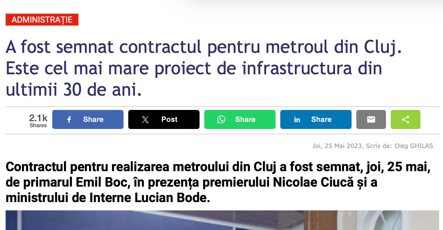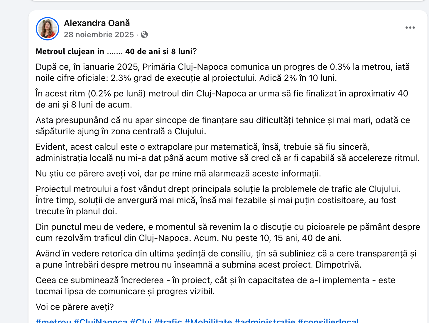 Azi discutăm și despre absurdul proiectului de metrou de la Cluj-Napoca, o inutilitate care oricum este întârziată, pentru care Boc vrea să toace 4 miliarde de euro, în timp ce România nu are bani nici să se cace în centru. Sunt absolut șocat că, deși proiectul pute a penal, deși sunt strigătoare la cer întârzierile și e imposibil să se estimeze un termen concret de finalizare, deși business planul arată prost de tot, nimănui nu pare să-i pese, mă refer la procurori sau opoziție. Că nouă, ziariștilor, ne pasă