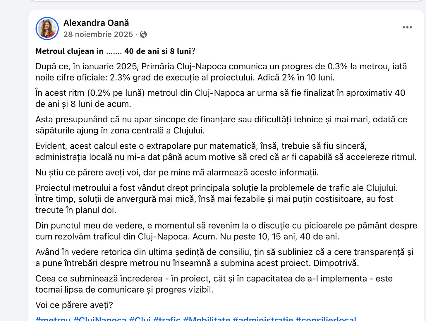 Deci Clujul a spart, cu mâna largă a lui Boc, 242 de milioane de euro pe un proiect superîntârziat din care nu s-a făcut mai NIMIC, dar chiar mai nimic. Iată ce remarca Alexandra Oana, consilier local USR Cluj, acum patru luni, citând un răspuns oficial al Primăriei: băăă, până și proiectul are un grad de execuție apropiat de zero barat, adică 2,3%!