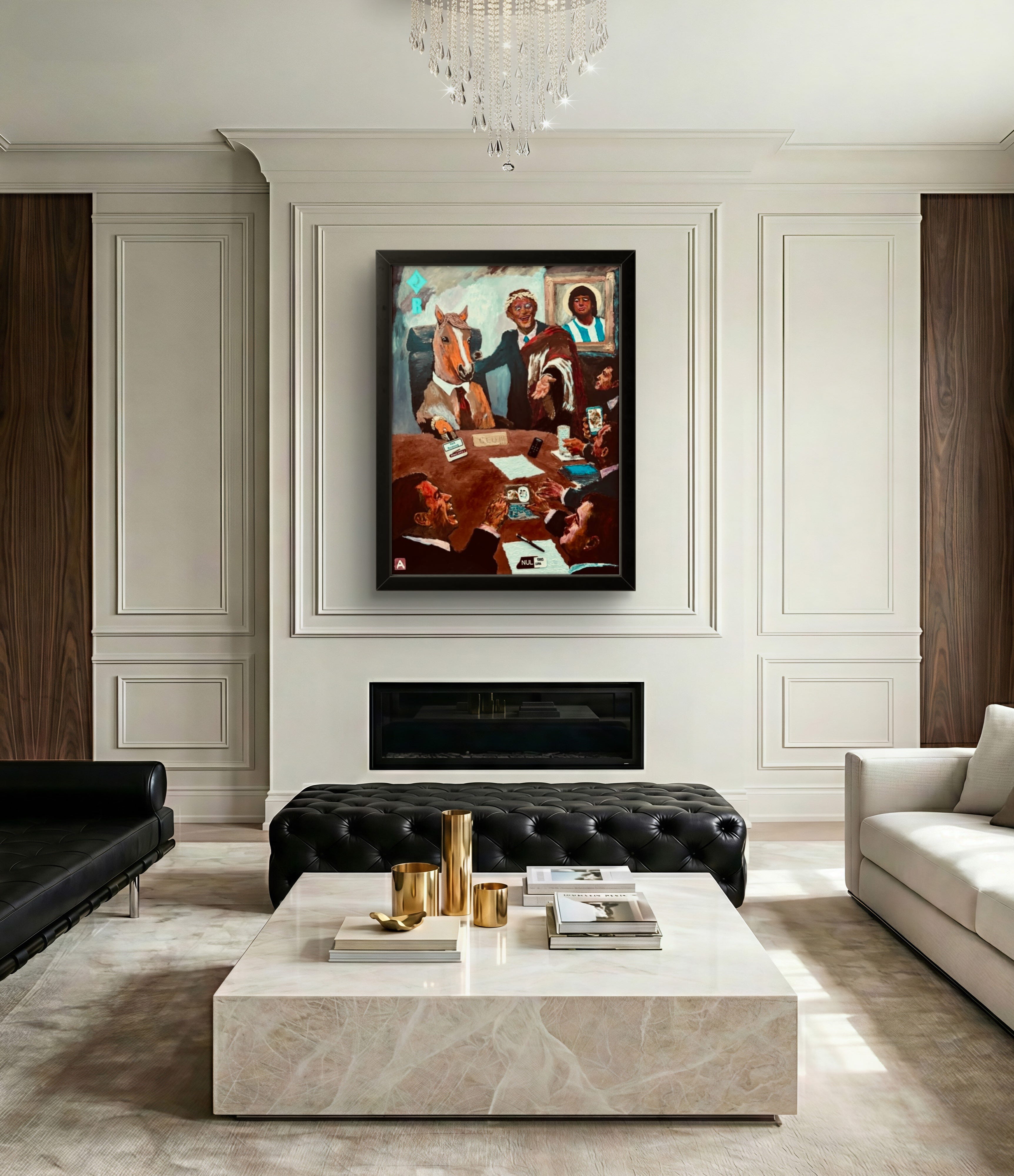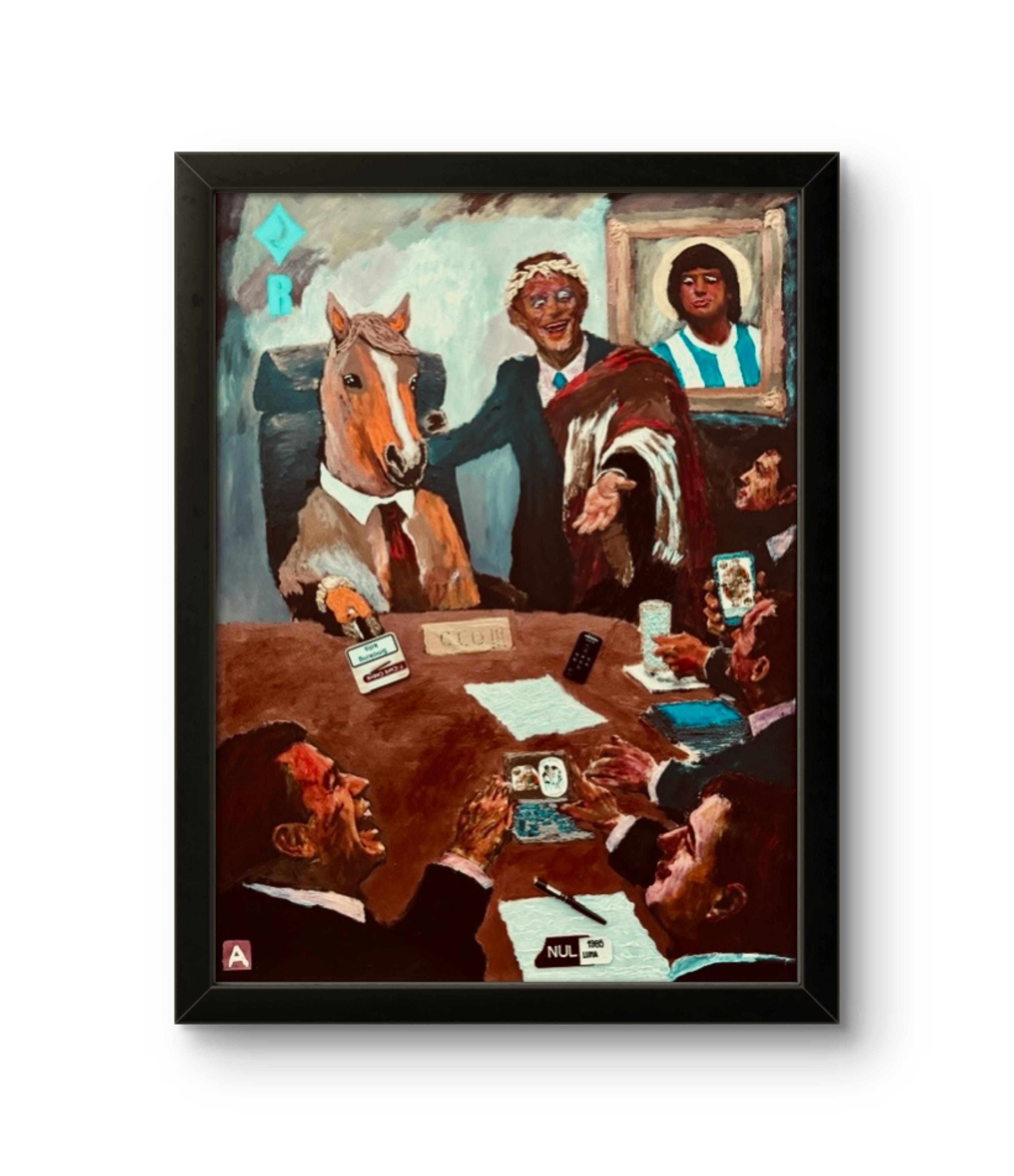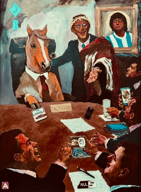 Pe peretele din spate, într-o ramă aurită cu nimb de sfânt, l-am pus Maradona şi nu întâmplător; același mecanism care l-a transformat pe un fotbalist genial și autodistructiv într-o divinitate globală e cel care pune un dobitoc la conducerea unei corporații: noi, oamenii, avem nevoie să ne îngenunchem în fața a ceva, oricât de absurd ar fi acel ceva. Chiar dacǎ totul e pe dos, nimeni nu se ridică de la masă.