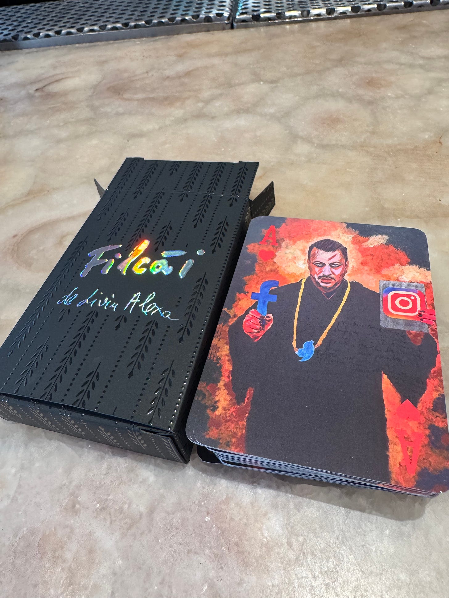 Pachetul de cărți de joc „Filcăi de Liviu Alexa” – ediție specială – conține cele 20 de cărți de joc redesenate de mine, 17 cărți de joc cu tablourile din expoziția „Noi suntem apocalipsa”, două cărți de joc cu cele două picturi senzaționale ale băiețelului meu, Ștefan, două cărți de joc cu afișele expozițiilor mele și cinci cărți de joc cu fotografii personale.
