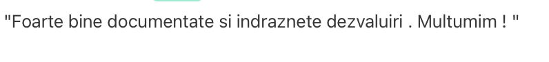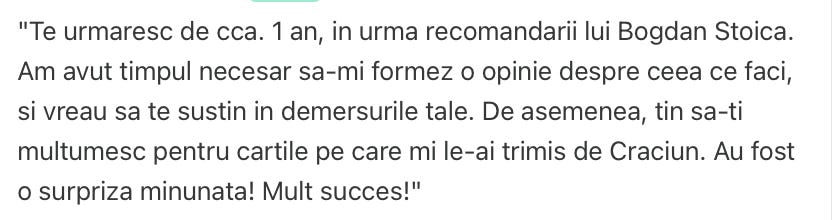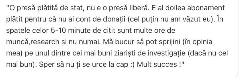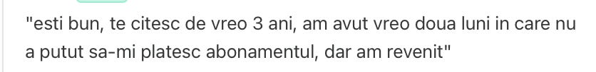 ca dau un semnal puternic jurnalistilor independenti si creatorilor ORIGINALI de a se apuca de treaba: independenta financiara e posibila si daca esti singur, romanii platesc pentru continut nu numai pentru Recorder si G4Media, de acum inainte sunt cel mai bun exemplu ca se poate. Am reusit greu, dupa nenumarate incercari ESUATE de a monetiza continutul platit, au ras multi de mine, dar nu am renuntat la ambitia mea si, pana la urma, uite, am atins succesul
